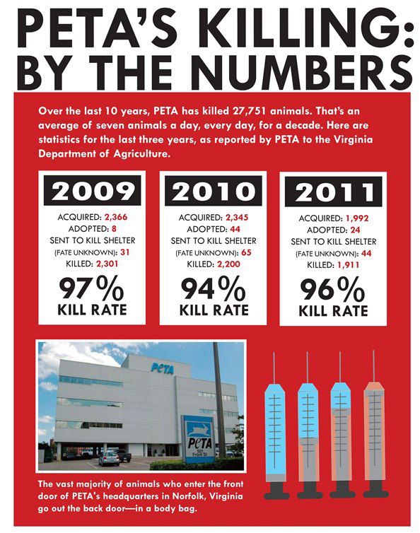 And, of course, there is no mention as to why PETA employees walked into a veterinary office, lied to the people working there about promising to find a healthy mother cat and her kittens a home and instead took those animals into the back of a van where they perhaps heard them purr, perhaps watched the kittens play, and then grabbed each one, restrained them, injected them with a fatal dose of poison, put their dead bodies in a garbage bag and then threw them in a dumpster. Without guilt, without remorse, without shame or anguish, they simply moved on to the next lie and the next victims. All told, PETA killed roughly 2,000 animals a year every year for the last 11 years, including those they labeled “healthy,” “adoptable,” “adoprable,” and “perfect”: 29,426 animals in all.