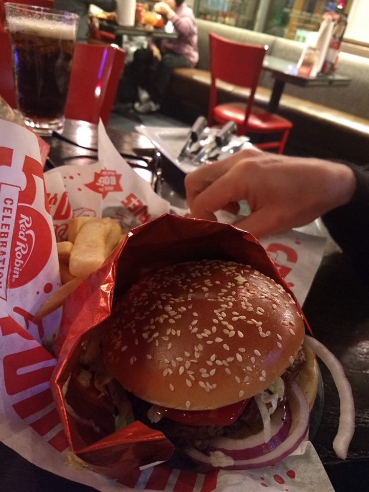 On Saturday night, Jennifer and I went to Red Robin, a nationwide chain, for the first time ever. Endless soda refills, bottomless fries, a roll of paper towels on every table, music playing, walls decorated with images that scream Americana (Einstein sticking out his tongue; a woman on the boardwalk rollerskating while holding a boombox), and families with children spilling their cokes and falling off their chairs (literally). It is situated in a mall no less, next door to Sears, with high school kids hanging out in small groups. Going there felt like stepping back in time to my own adolescence in the 1980s, even though, ironically, I was there to taste the future.