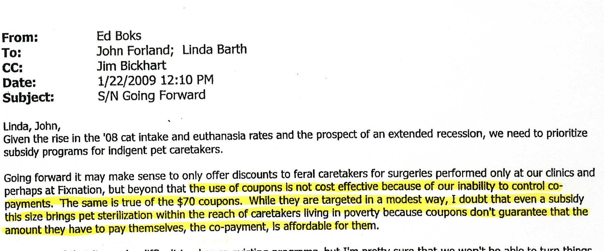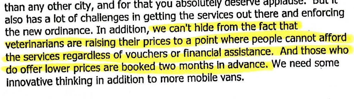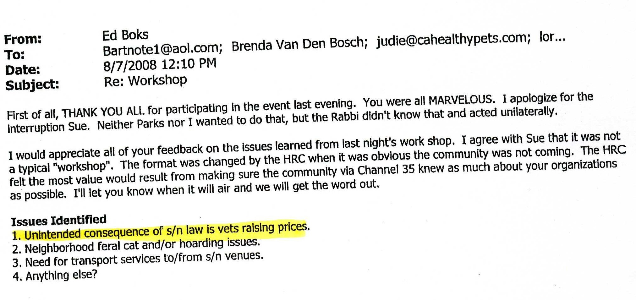 In a 2008 e-mail to Ed Boks, a supporter writes to Ed that “we can’t hide from the fact that veterinarians are raising their prices to a point where people cannot afford the services regardless of the vouchers or financial assistance.” (To help defray these rising costs, the City was offering $30 vouchers, and in a smaller number of cases, $70 vouchers, toward the cost of sterilization.) By August 2008, Boks admitted a problem and indentified what he called the “unintended consequence of s/n law is vets raising prices,” though he did not share this information with legislators he was lobbying to pass statewide mandatory spay/neuter.*