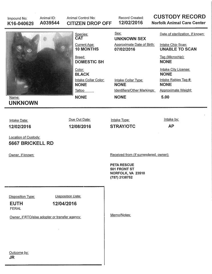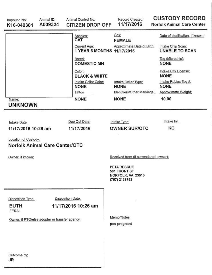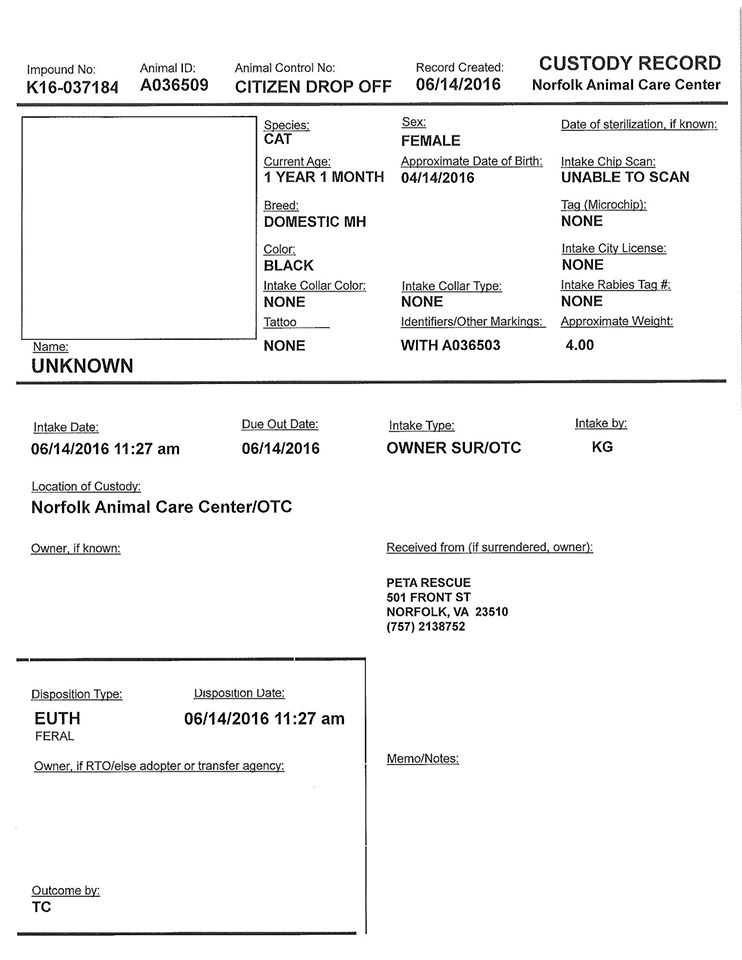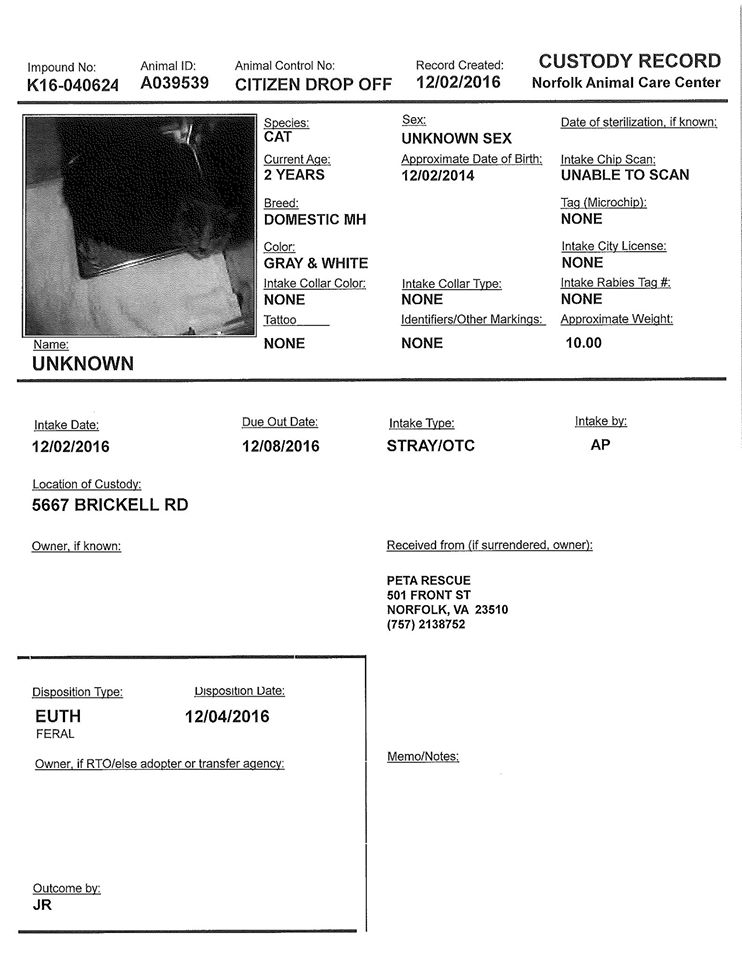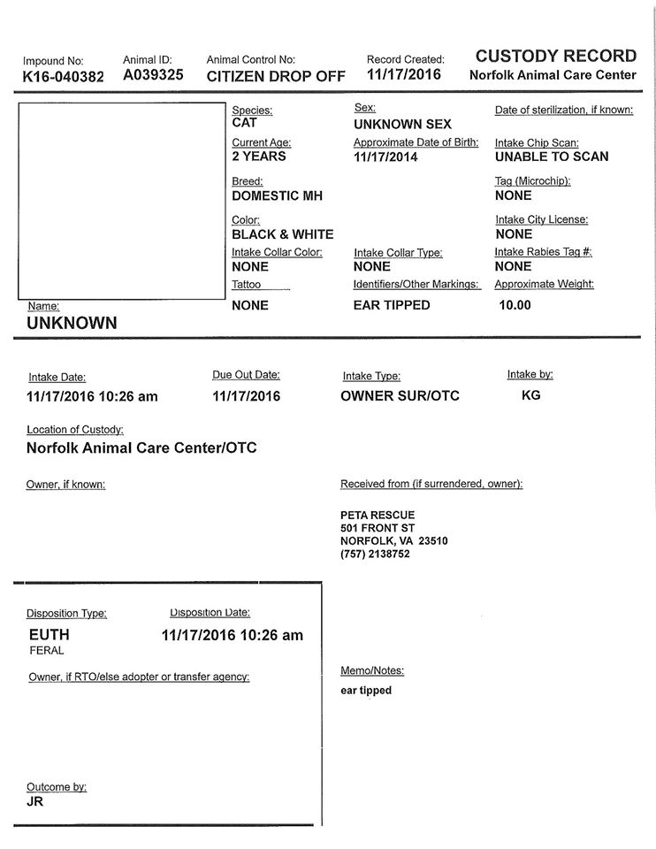 1 1/2 year old community cat taken to the Norfolk, VA, pound by PETA. Intake date is noted as June 17, 2016 at 10:26 am. The cat is noted to have been killed on the same day at the same time.