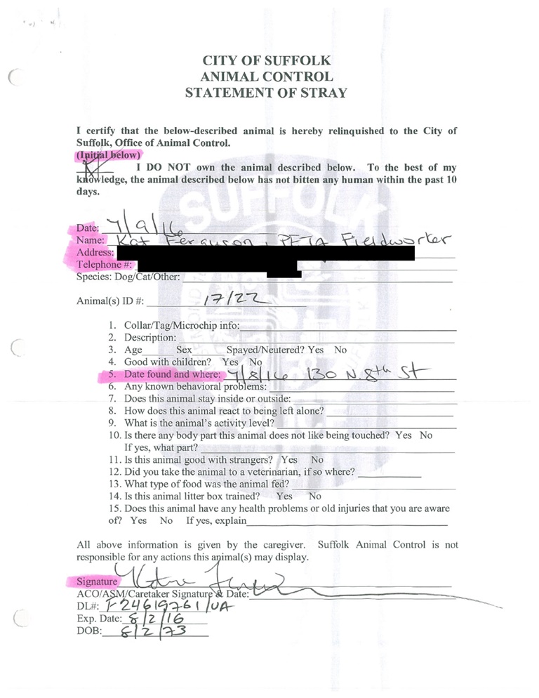 The three-month old was surrendered to the pound by a PETA fieldworker: