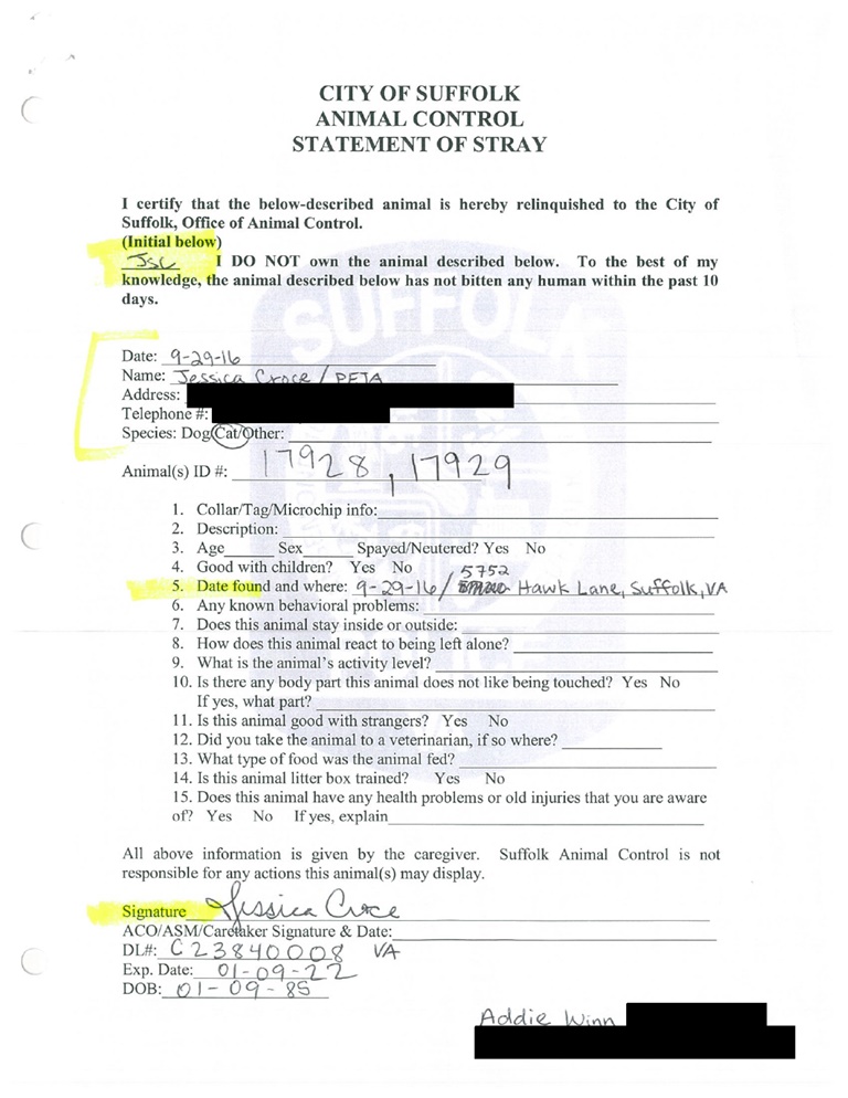 Last week I reported about all the kittens PETA rounded up and took to the Peninsula Regional Animal Shelter in Newport News, VA, to be killed. PETA logged them as “live releases,” but only two (out of 20) were spared. Among the dead were unweaned neonatal kittens, six week old kittens, eight week old kittens, four month old kittens, seven month old juveniles, one year old juveniles, and adult cats. They were listed as having no illness or injuries. Some of them were killed within minutes.