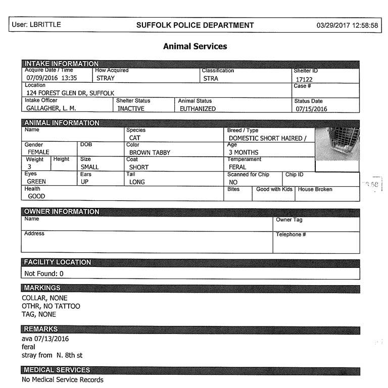 She was listed as a brown tabby with green eyes in “good” health. Despite being a baby with her whole life ahead of her, Suffolk police killed her: