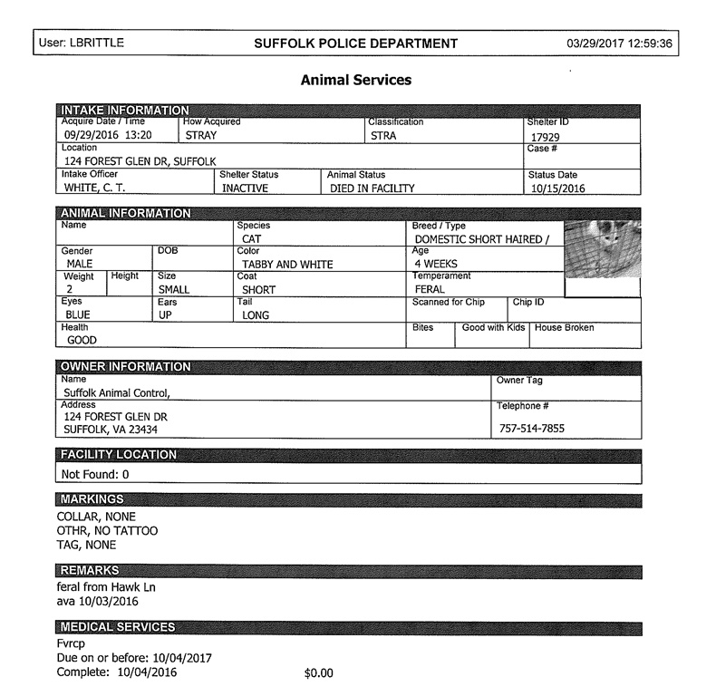 Tragically, PRAS isn’t the only regressive pound PETA sends kittens to kill. PETA sent three kittens to the pound run by the Suffolk, VA, police department: a three-month old kitten and two kittens listed as “4 weeks old” (although they appear to be closer to eight weeks old). All three are now dead.