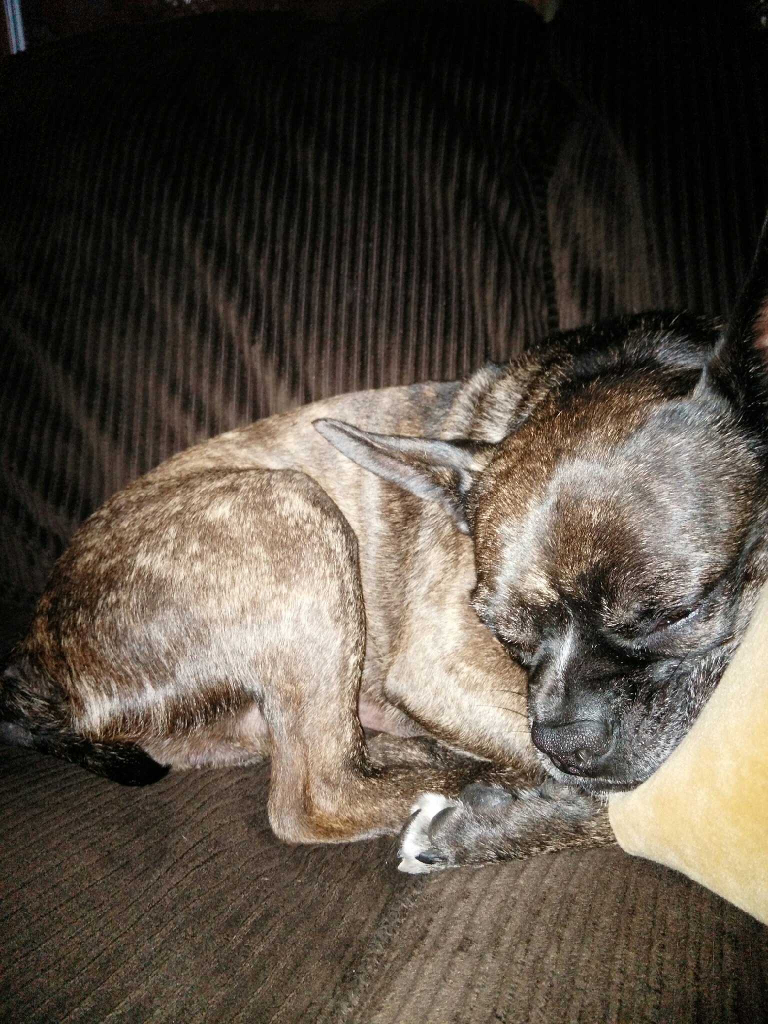 After a long day of squirrel patrol – four miles of walking hills, scanning trees, and alerting the neighborhood whenever he sees one – a tuckered Oswald wraps himself into a little ball and takes a nap on the couch. Tomorrow, he goes back on patrol.
