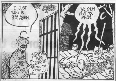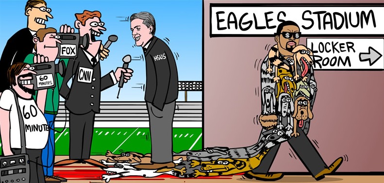 While Pacelle, through HSUS, testified that the dogs Vick abused should not be given a second chance and should all be killed, Pacelle said that their abuser should be. Vick became a spokesman for HSUS. Or was it the other way around? In the nokillblog.com’s cartoon, Pacelle rides Vick’s blood-stained coattails to his favorite destination—the front pages of the New York Times, 60 minutes, and other media.