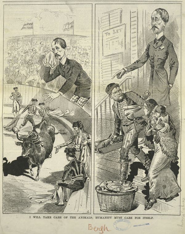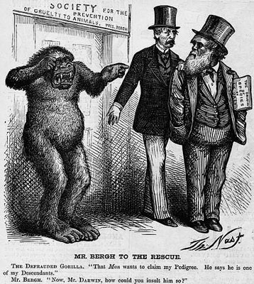 Sadly, the political cartoons of Bergh’s day often mocked him. Here, two cartoons depicting Henry Bergh try to assassinate his character by claiming he cares about animals, but not people. In the cartoon above, Bergh is weeping at a bull fight but telling the poor of New York City to get off his property. In the cartoon below, Bergh is chastising Charles Darwin for insulting the crying gorilla by suggesting the gorilla is related to humans.