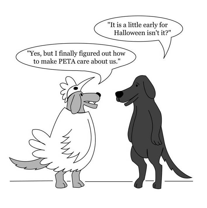 In this No Kill Advocacy Center cartoon above, a dog dresses like a chicken in hopes of getting PETA to care about him, too. Unfortunately, the previous cartoon turned out to be wrong. PETA also kills other animals, including chickens, as well, which it does at its Norfolk, VA facility. The cartoon below turned out to be more accurate, as the chicken in the shelter fears for his life as much as the dogs and cats do.