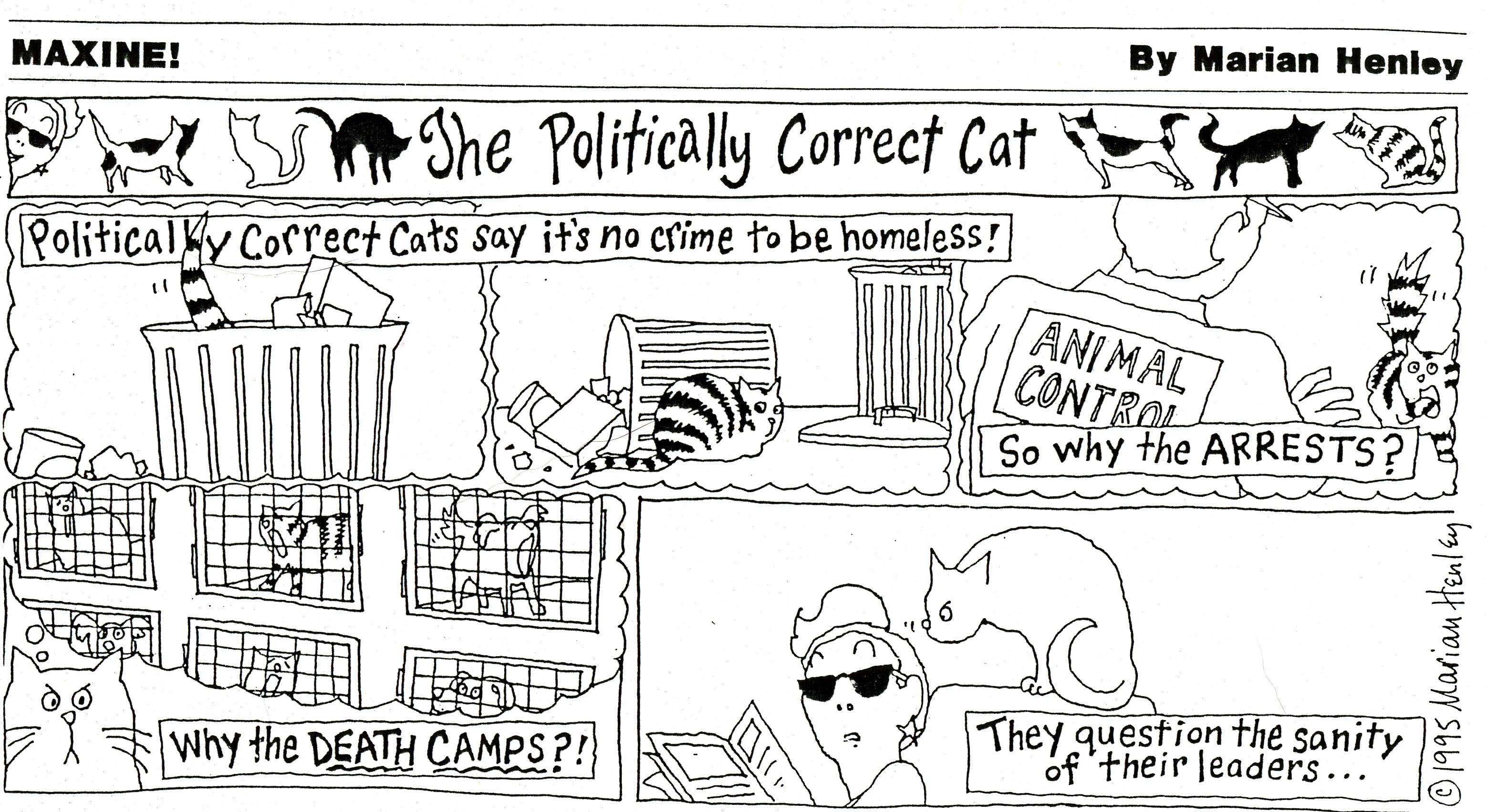 In contrast to the Pollyanna pieces done by comics such as Patrick McDonnell about shelters (Mutts), this piece actually captured the typical American animal control shelter. Animal control, supported historically by groups like the Humane Society of the United States, consider being a lost, stray or feral cat a death sentence. Animal Control officers are often empowered to round them up and kill them. And these organizations promote and embrace laws which give animal control officers even more power. In California, a proposed law in 1994 would have empowered officers to kill cats immediately upon capture on the street if they did not have proof of a rabies vaccination—which would have resulted in mass slaughter. This 1995 cartoon captured that reality.