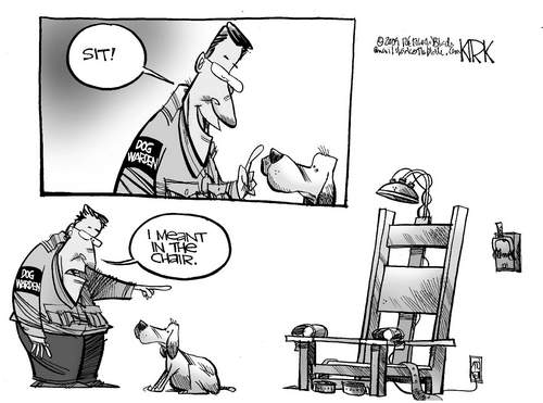 As occurs all over the country, Tom Skeldon, the Lucas County, Ohio dog warden, killed animals, despite readily available lifesaving alternatives. Indeed, he killed dogs and puppies even when rescue groups and humane societies offered to save them. In this Toledo Blade cartoon, Skeldon is telling a dog to sit, which the dog does, demonstrating that he is a kind, friendly, and obedient dog, which should please the warden. It doesn’t. Skeldon wants the dog to sit in the electric chair, so he can be put to death. What made this cartoon so dramatic is that it resonated so strongly with the experience many rescuers have of their own dog wardens and pound directors. Skeldon may have been less polished than others, but he was hardly unique. Indeed, this comic could have been published in virtually any newspaper—Houston (TX), King County (WA), Los Angeles (CA), and hundreds of other cities—and it would have had the same meaningful impact. Thankfully, Skeldon was forced out, but others like him remain entrenched in shelters all across the country.