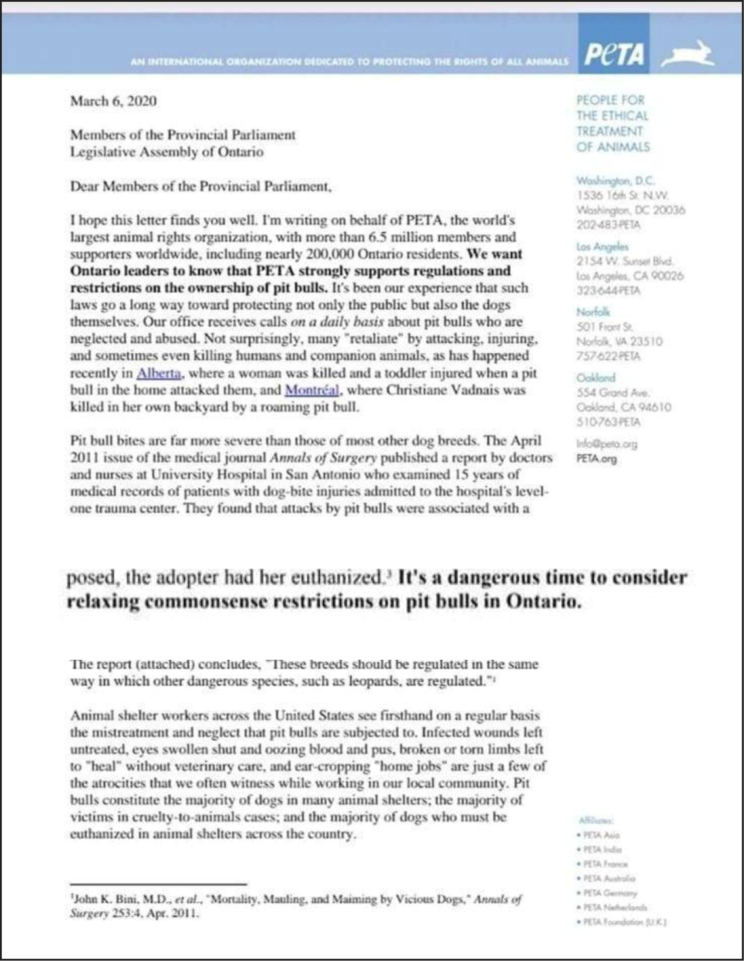PETA has written members of the Ontario, Canada, legislature to tell them NOT to consider relaxing what they called “commonsense restrictions on pit bull in Ontario,” saying “These breeds should be regulated in the same way in which other dangerous species, like leopards, are regulated.”