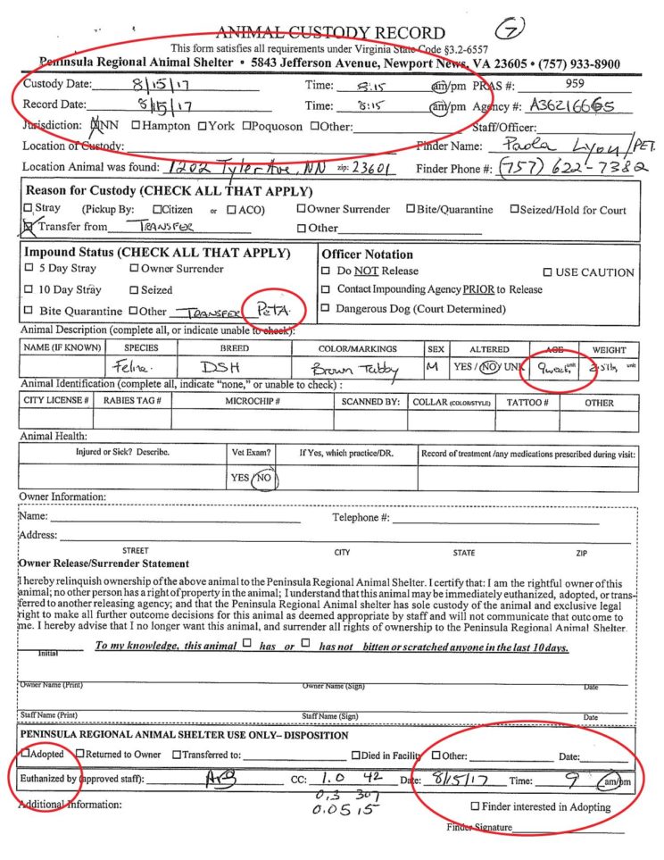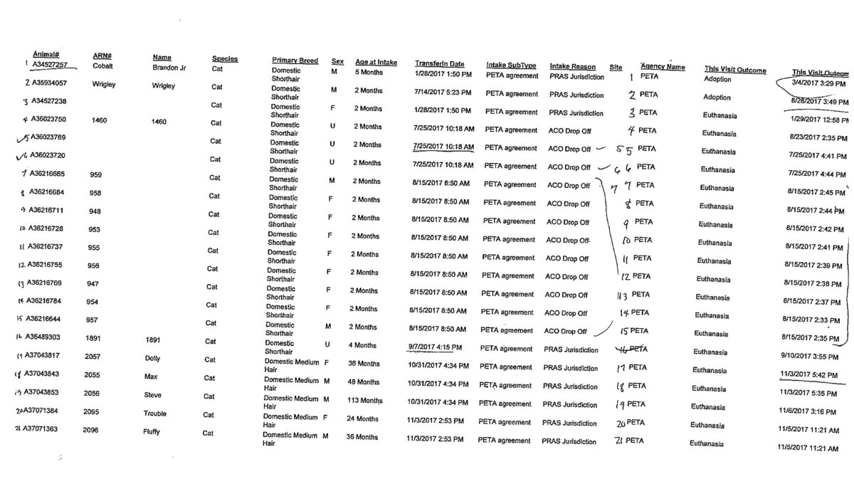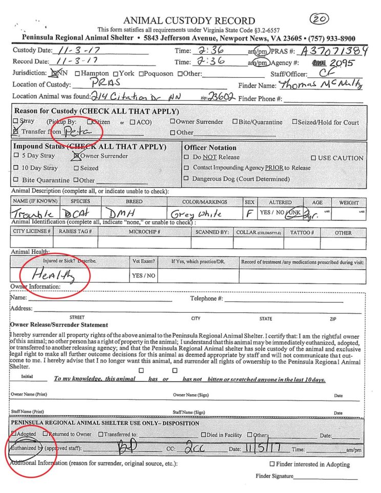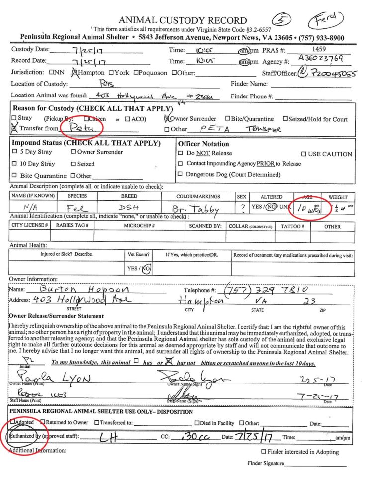 For example, of the 21 cats and kittens PETA took to the Peninsula Regional Animal Shelter (PRAS) in Newport News, VA, and which PETA logged as “live releases,” intake documents reveal that all but two were killed. In fact, PRAS has an ongoing “agreement” with PETA: PETA brings them healthy community cats and kittens and the pound kills them.