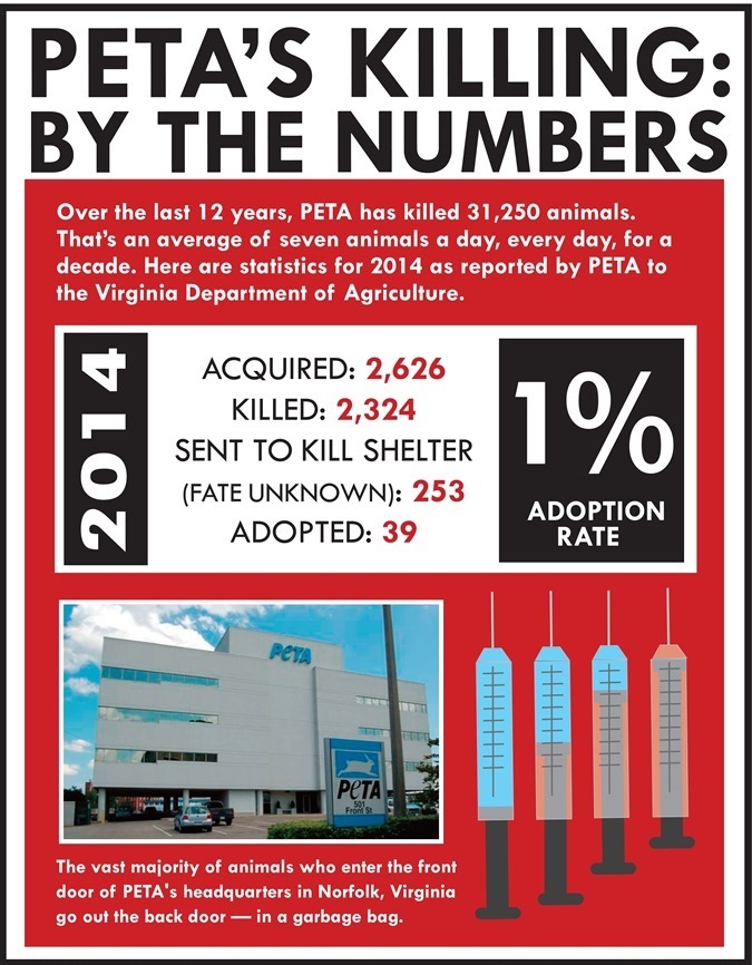 - Not the reports and inspections of PETA by the Virginia Department of Agriculture, which oversees shelters where PETA is headquartered. These reports reveal that up to 99% of all animals PETA impounds end up dead, without ever being made available for adoption: