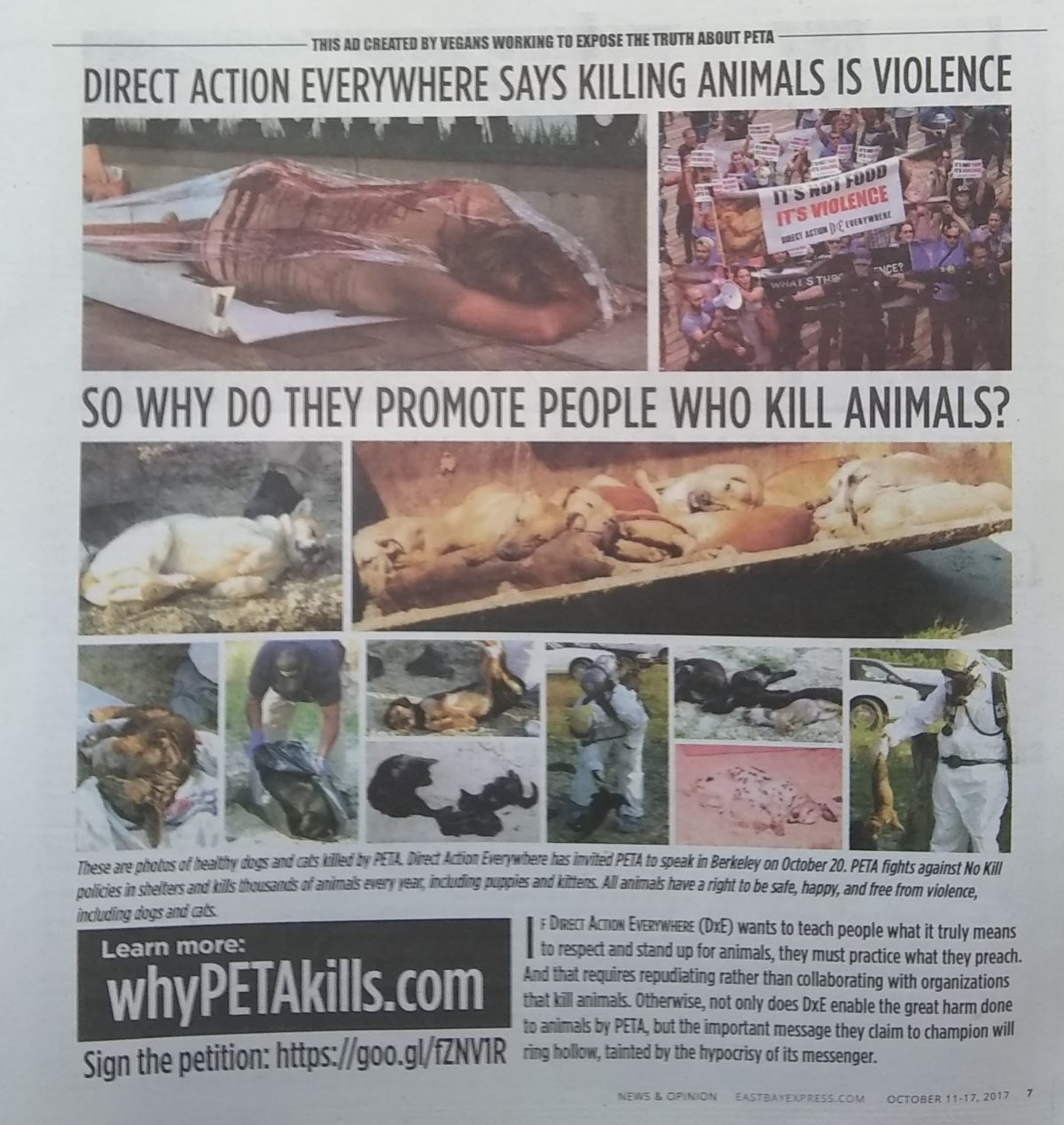 This week, this full page ad ran in the East Bay Express to protest the fact that Ingrid Newkirk, the Butcher of Norfolk, has been invited to the Bay Area to give the keynote address at an upcoming conference sponsored by Berkeley-based group Direct Action Everywhere (DxE).