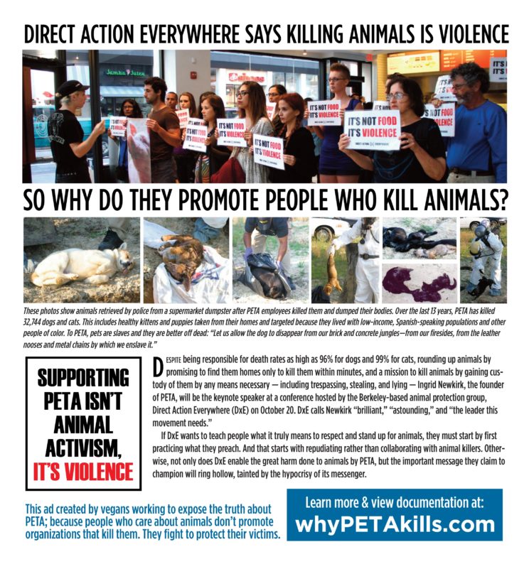 In addition to contacting local pit bull advocacy groups, rescue groups, and local politicians to inform them that DxE has invited one of the nation’s loudest voices advocating for the genocide of pit bulls, community cats, and other animals in our community, I will also be running ads in local publications to this effect, and I need your help to do so.