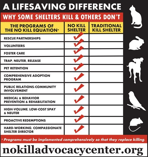 Animals enter shelters for a variety of reasons and with a variety of needs, but for over 100 years, the “solution” has been the same: adopt a few and kill the rest. The No Kill Equation provides a humane, life-affirming means of responding to every type of animal entering a shelter, and every type of need those animals might have. Some animals entering shelters are feral cats. At traditional shelters, they are killed, but at a No Kill shelter, they are neutered and released back to their habitats. Some animals entering shelters are motherless puppies and kittens. At traditional shelters, these animals are killed as well. At a No Kill shelter, they are sent into a foster home to provide around-the-clock care until they are eating on their own and old enough to be adopted. Some animals have medical or behavior issues. At a traditional shelter, they are killed. At a No Kill shelter, they are provided with rehabilitative care and then adopted. Whatever the situation, the No-ˆKill Equation provides a lifesaving alternative that replaces killing.