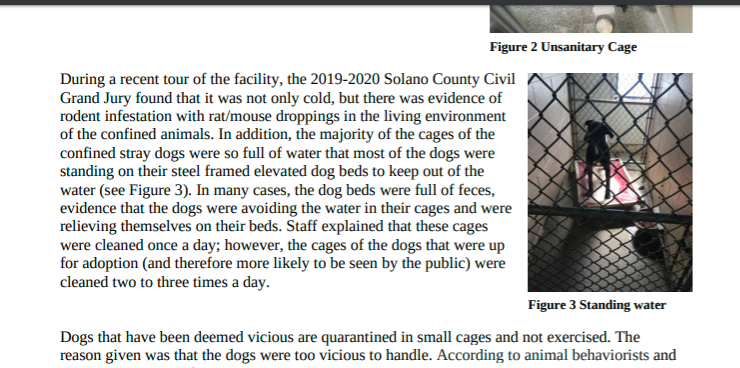 The Solano County Grand Jury recently issued a report recently after doing an inspection of the county shelter. Jurors found “evidence of rodent infestation with rat/mouse droppings in the living environment of the confined animals. In addition, the majority of the cages of the confined stray dogs were so full of water that most of the dogs were standing on their steel framed elevated dog beds to keep out of the water: In many cases, the dog beds were full of feces, evidence that the dogs were avoiding the water in their cages and were relieving themselves on their beds.”