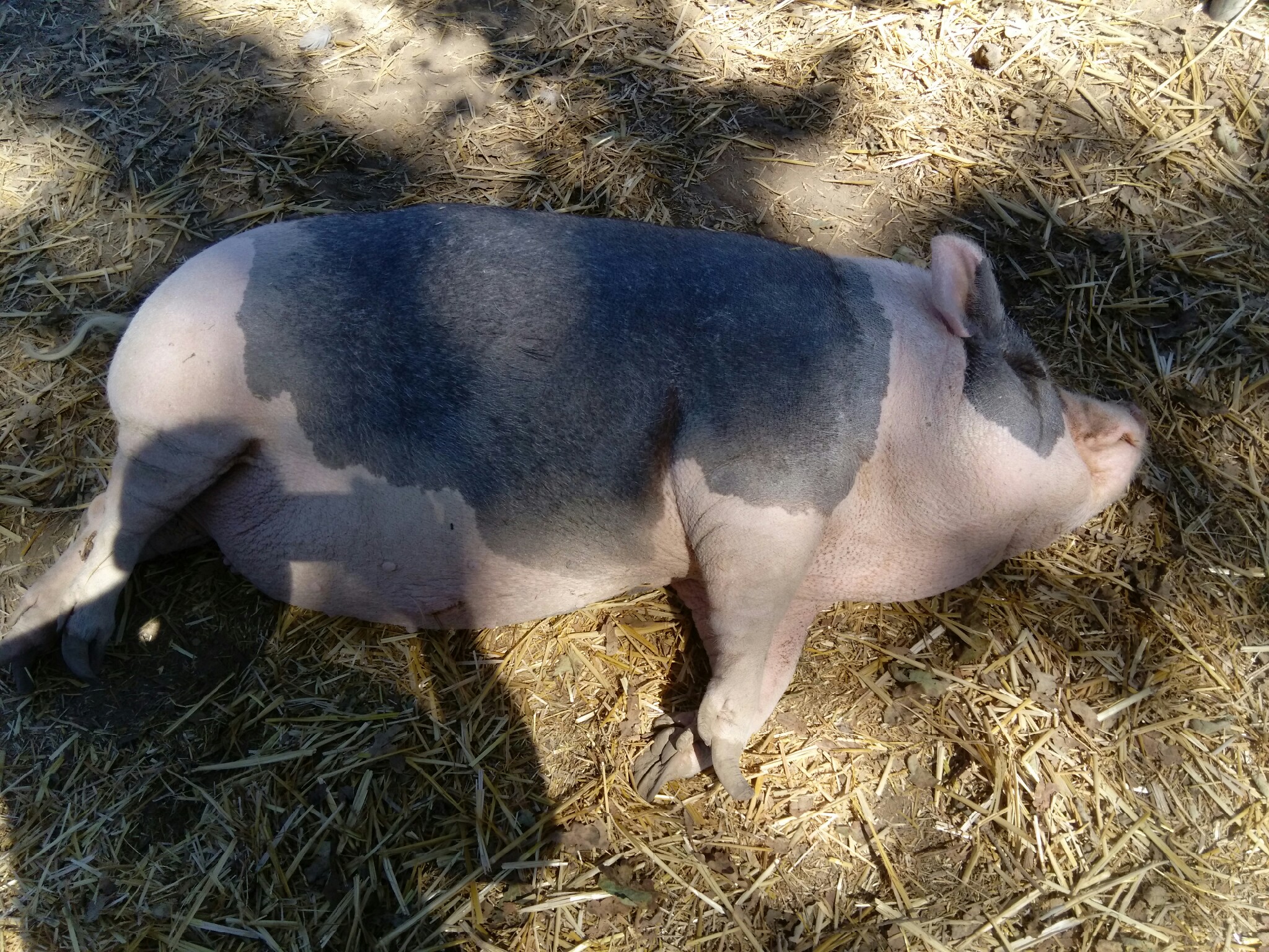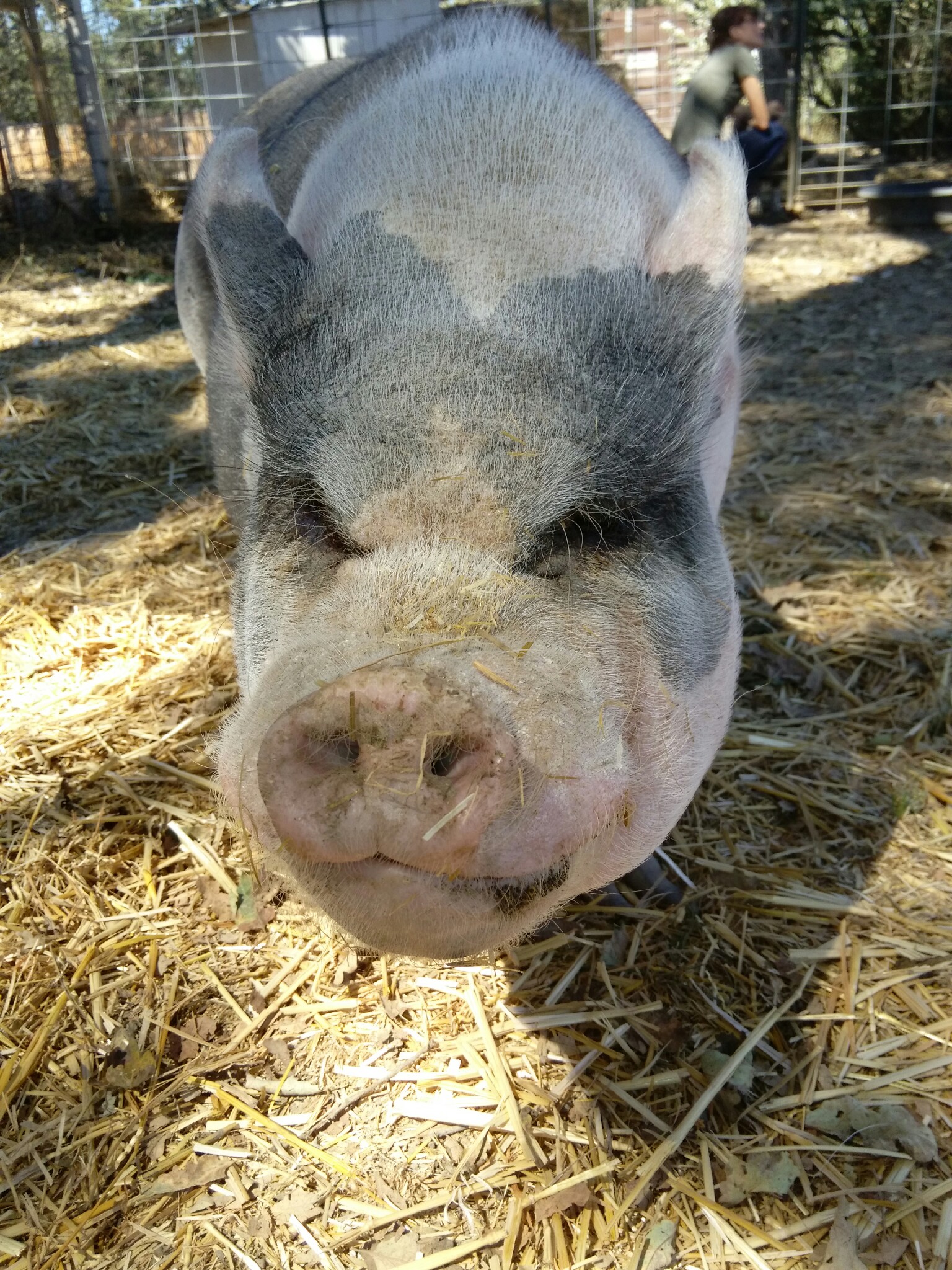 This is Wilbur, a rescued pig at the Sonoma Humane Society. When I walked up to his pen, he was sleeping in his straw bale house in the shade. I called to him like I would a dog, and he came running up to me. I started scratching his back the way I scratch Oswald, my dog, and said the same thing to him that I say to Oswald: “Who’s my piggy boy?” He made the same kind of snorting noises that Oswald does. The difference, of course, is that Wilbur is a pig and Oswald only sounds like one. Other than that, they acted exactly the same. They come when I call, they snort when I scratch, they roll over on their back for some tummy action, and the quickest way to their hearts is through their stomach:Ozzie loves Tofurky slices; Wilbur loves heirloom tomatoes.